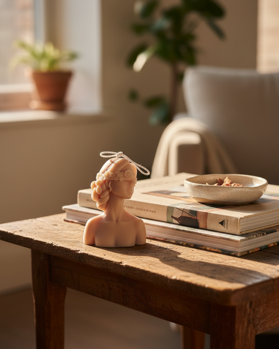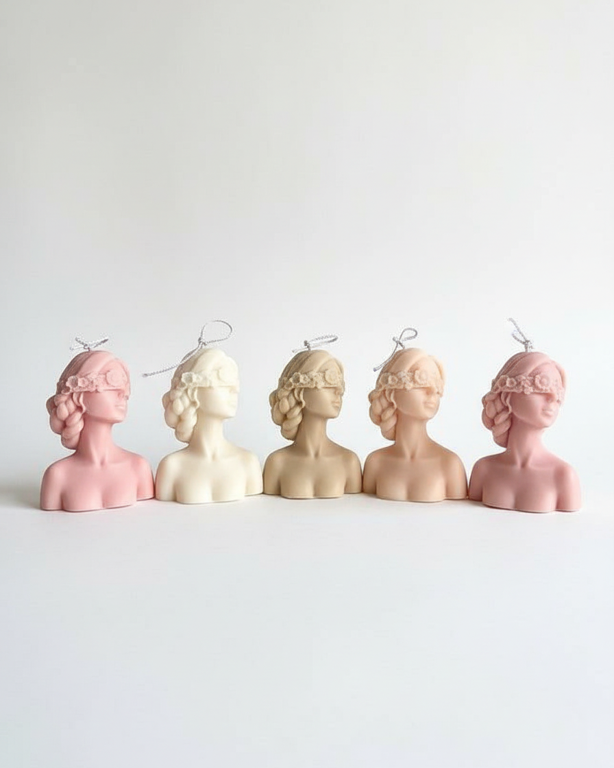 A floral blindfold girl candle that's as much art as it is fragrance. The Blindfold Lady sculpture candle creates an instant talking point in any home — beautiful, whimsical, and uniquely crafted as a gift for any woman who appreciates art and fragrance.