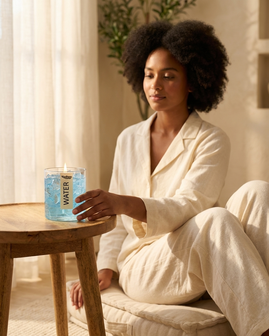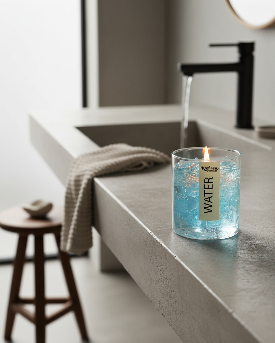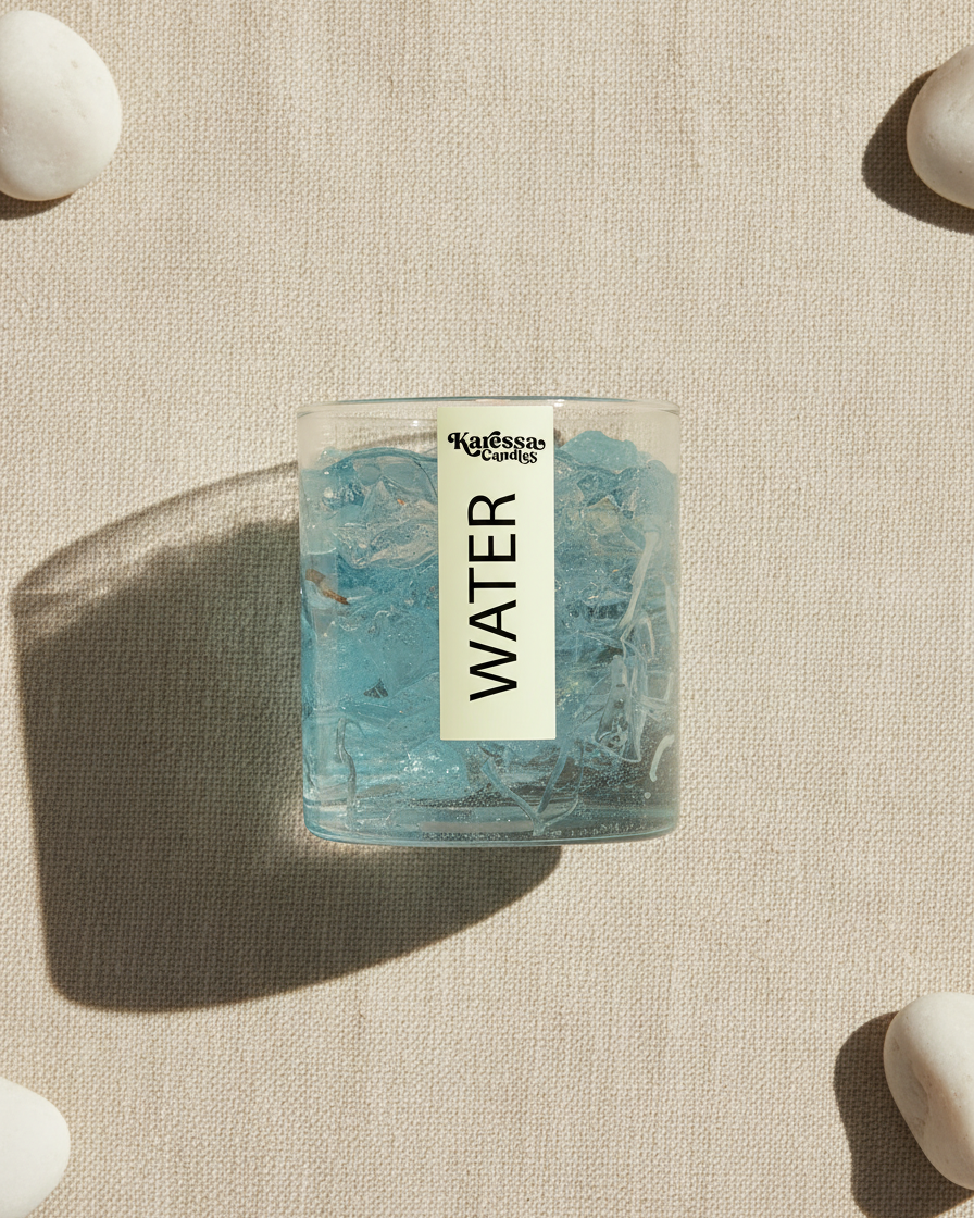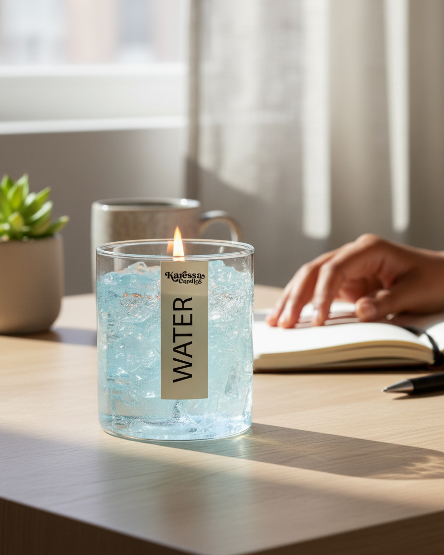 Completely unique in the Indian candle market — this gel wax candle looks exactly like a glass of iced water. The crystal-clear gel wax with embedded 'ice cubes' creates a stunning visual effect that stops people in their tracks. Scented with fresh ocean breeze.