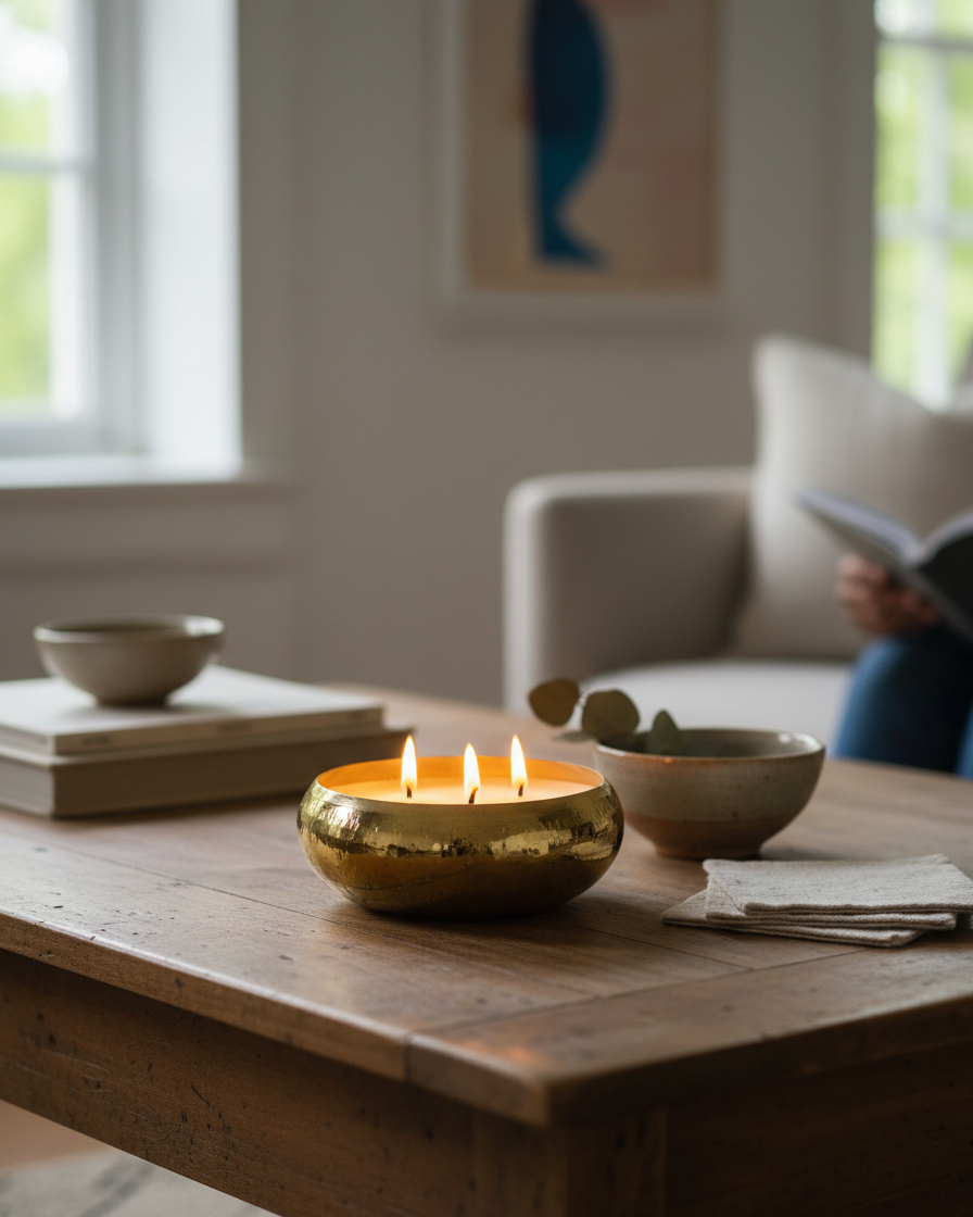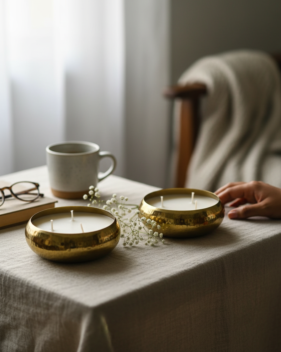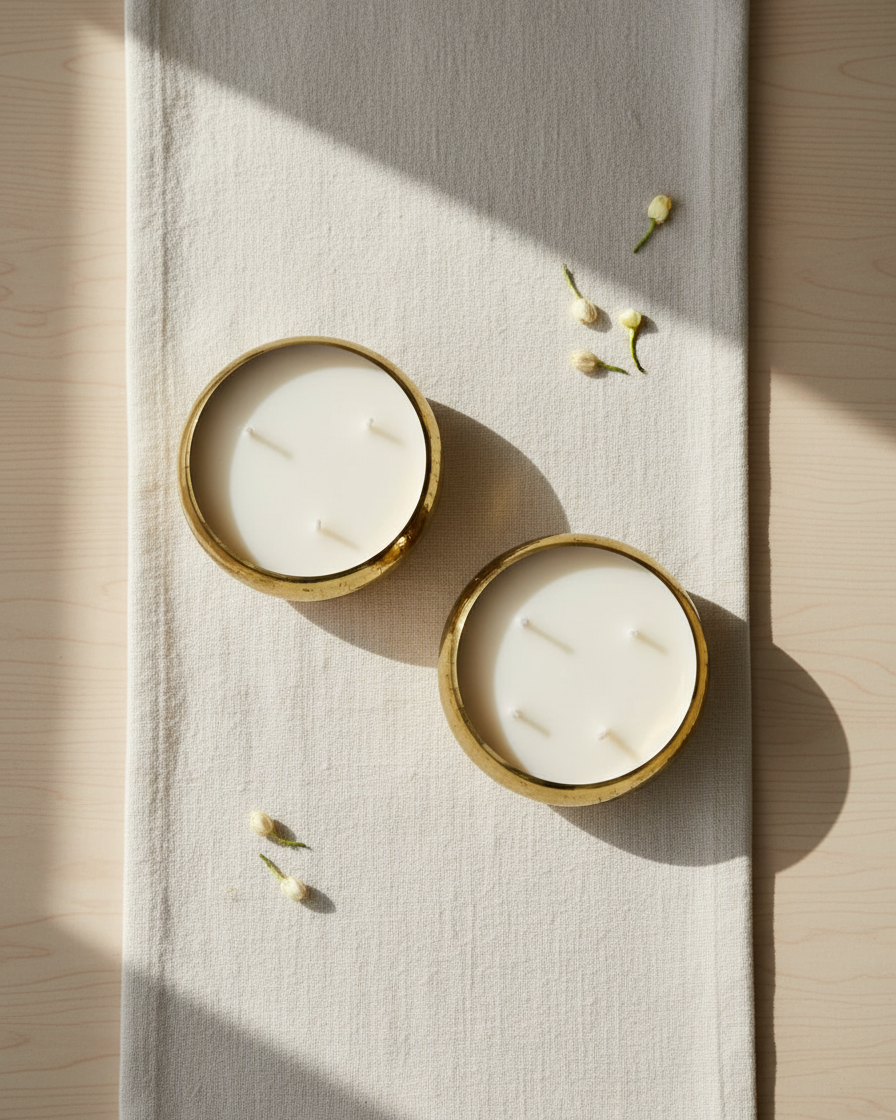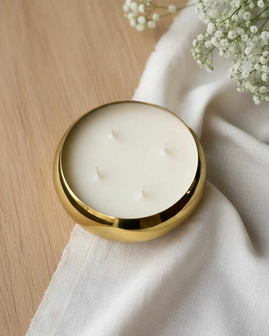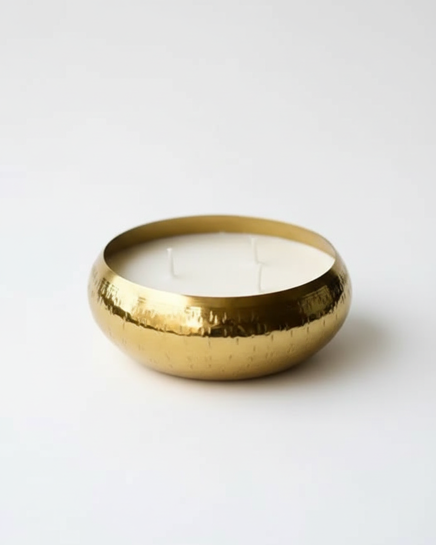 A wide round urli bowl filled with premium soy wax — the traditional Indian vessel meets modern candle craft. The wide bowl shape creates a larger melt pool than narrow jars, filling your home with fragrance more thoroughly and beautifully.