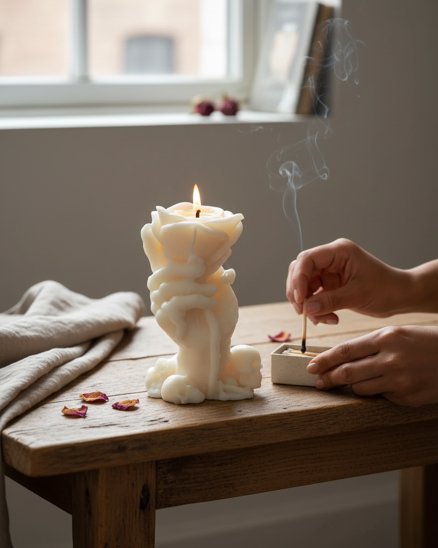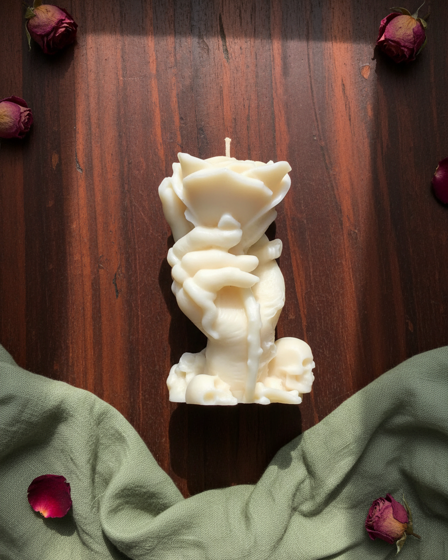 Romantic with an edge. The Witch Hand with Rose Candle is for those who find beauty in the dramatic — a sculpted witch's hand cradling a rose, creating the most unique Valentine's proposal or dark-romantic gift in the Karessa collection.
